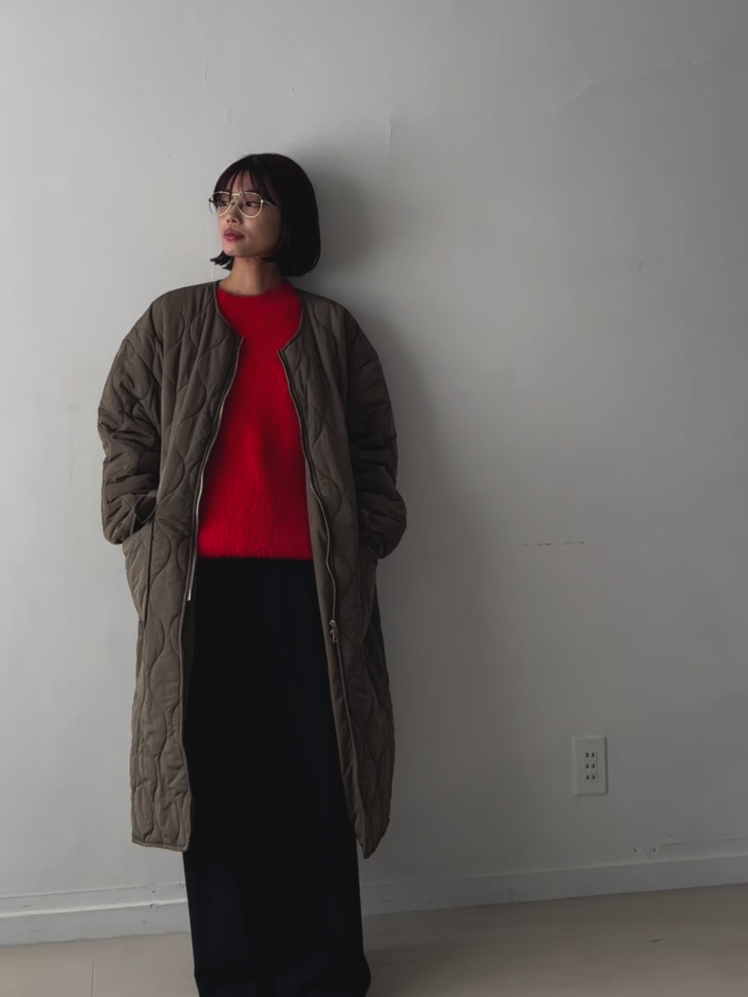 ノーカラーデザインで女性らしく、すっきりと着れるキルティングコート。