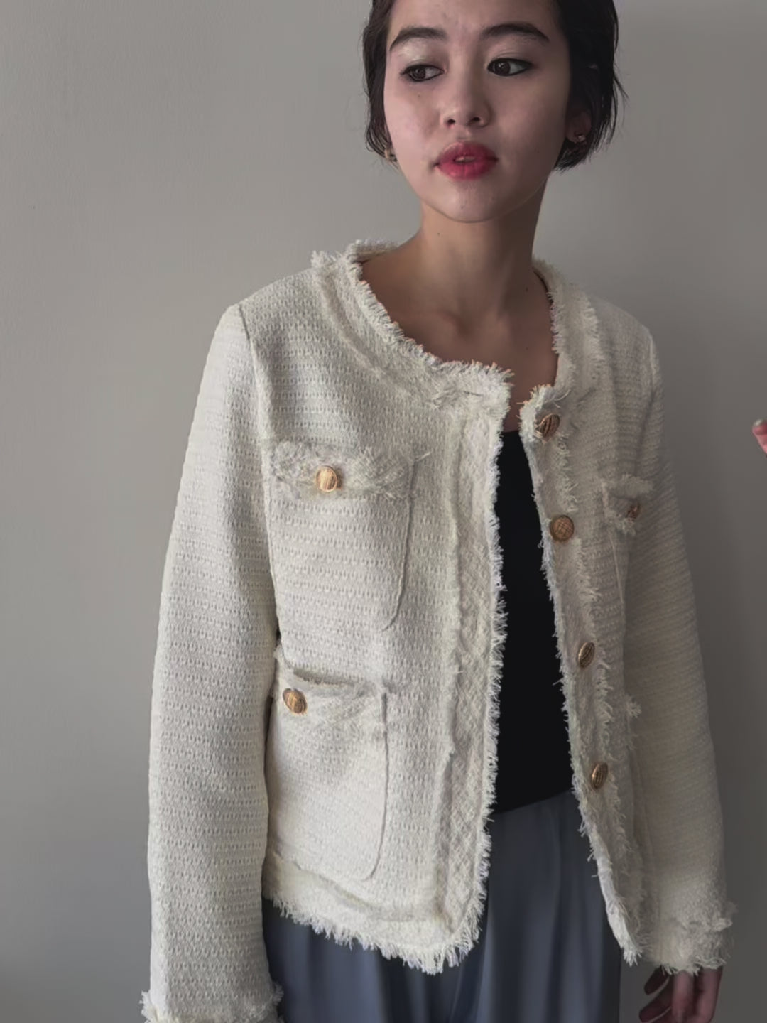 トレンドのツイード生地で仕上げたノーカラージャケット。