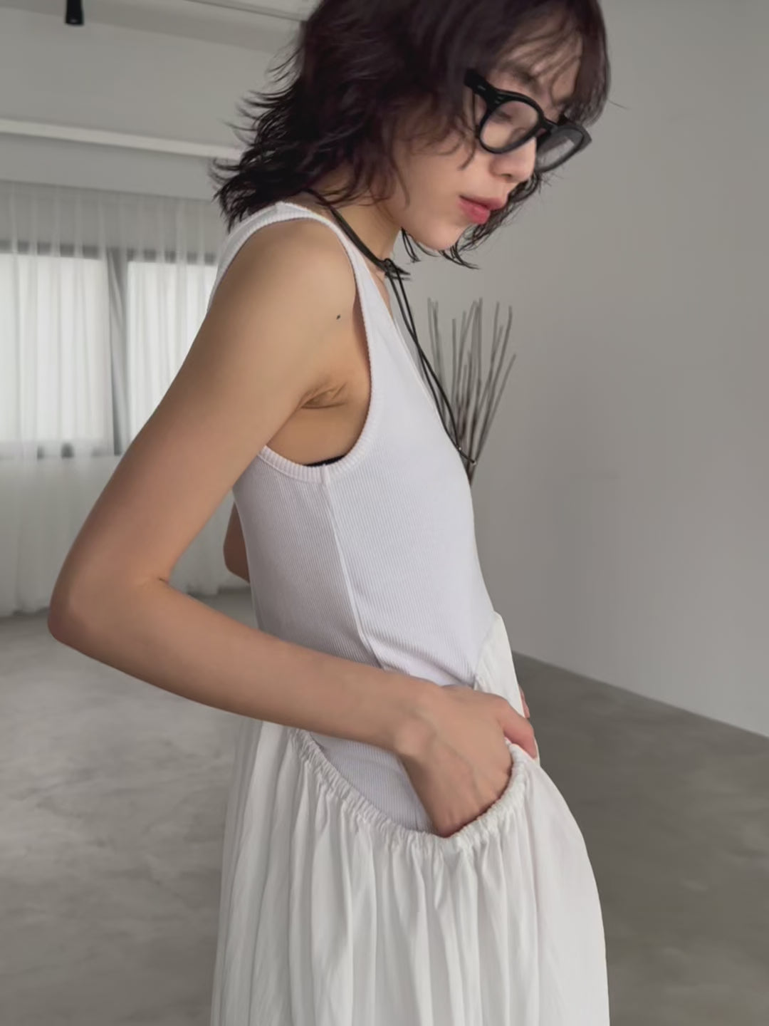 伸縮性のあるリブタンクトップと、ハリ感のあるスカートをドッキングした